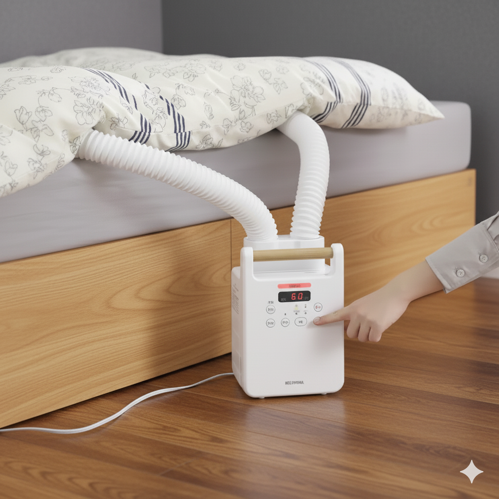 この製品の最大の魅力は、なんといってもその「手軽さ」にあるでしょう。従来のふとん乾燥機にあったような、大きなマットを広げたり畳んだりする手間は一切ありません。本体から2本のノズルを伸ばし、ふとんの間に差し込み、スイッチを押す。たったこれだけのアクションで、温かい空気がふとんの隅々まで行き渡り始めます。